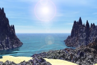 | Ein Planet von Sirius wäre eine sehr jungfräuliche Welt - junge, seichte Ozeane und kaum erodierte Landmassen, dazuu eine dicke und feuchte Atmosphäre, und über allem eine gleißend helle, weiße Sonne. Am Grund der Ozeane, geschützt vor der harten UV-Stralung, ziehen vielleicht schon einfache, bakterienähnliche Lebensformen ihre Kreise, genährt von unterseeischen thermalen Quellen. Schon etlliche Meter unterhalb der Wasseroberfläche würde jegliches Leben schnell von der intensiven ultravioletten Strahlung getötet werden. |